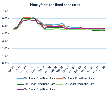 • The top one-year fixed bond fell to 4.45% gross, which is 0.19% lower than the top five-year fixed bond at 4.64%. The top five-year bond rate was higher than the top one-year bond a month prior by 0.14%.